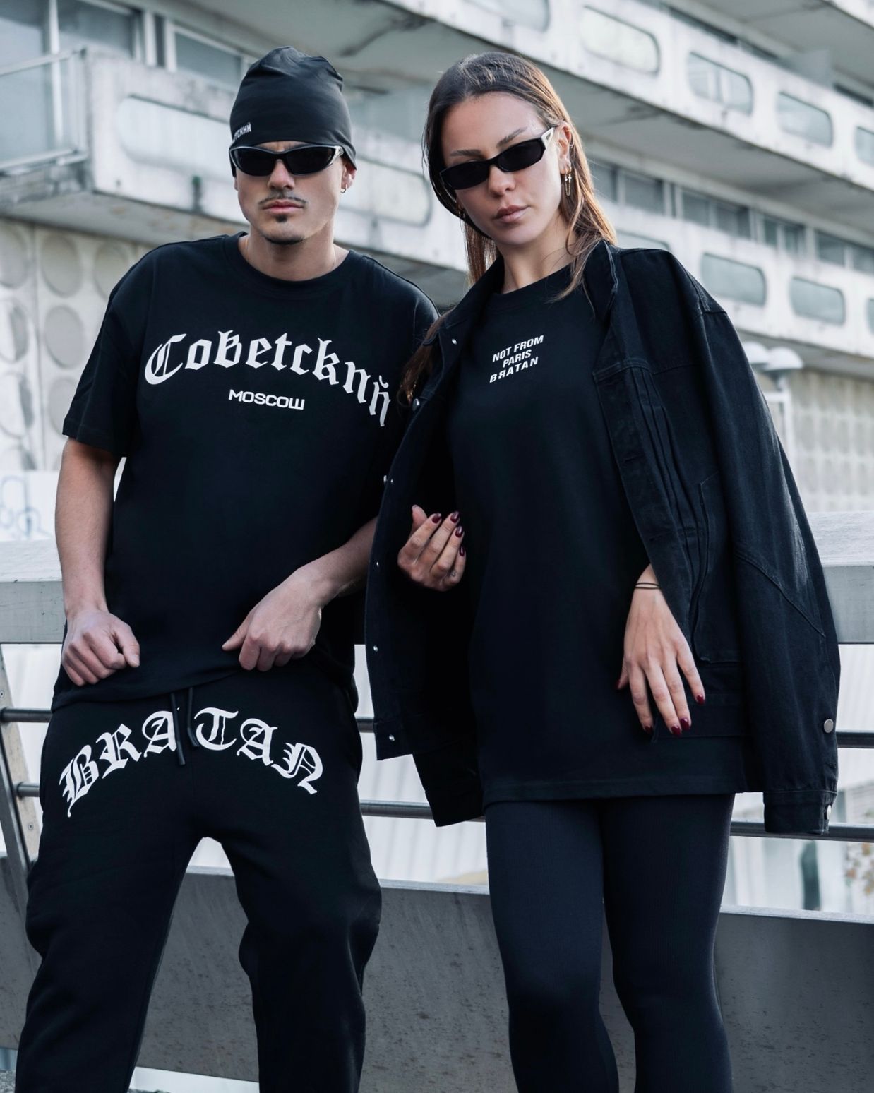 T-shirt oversize noir, 100% coton, avec l’inscription “Советский” et le marquage MOSCOW juste en dessous pour un rendu brut, identitaire et minimaliste.