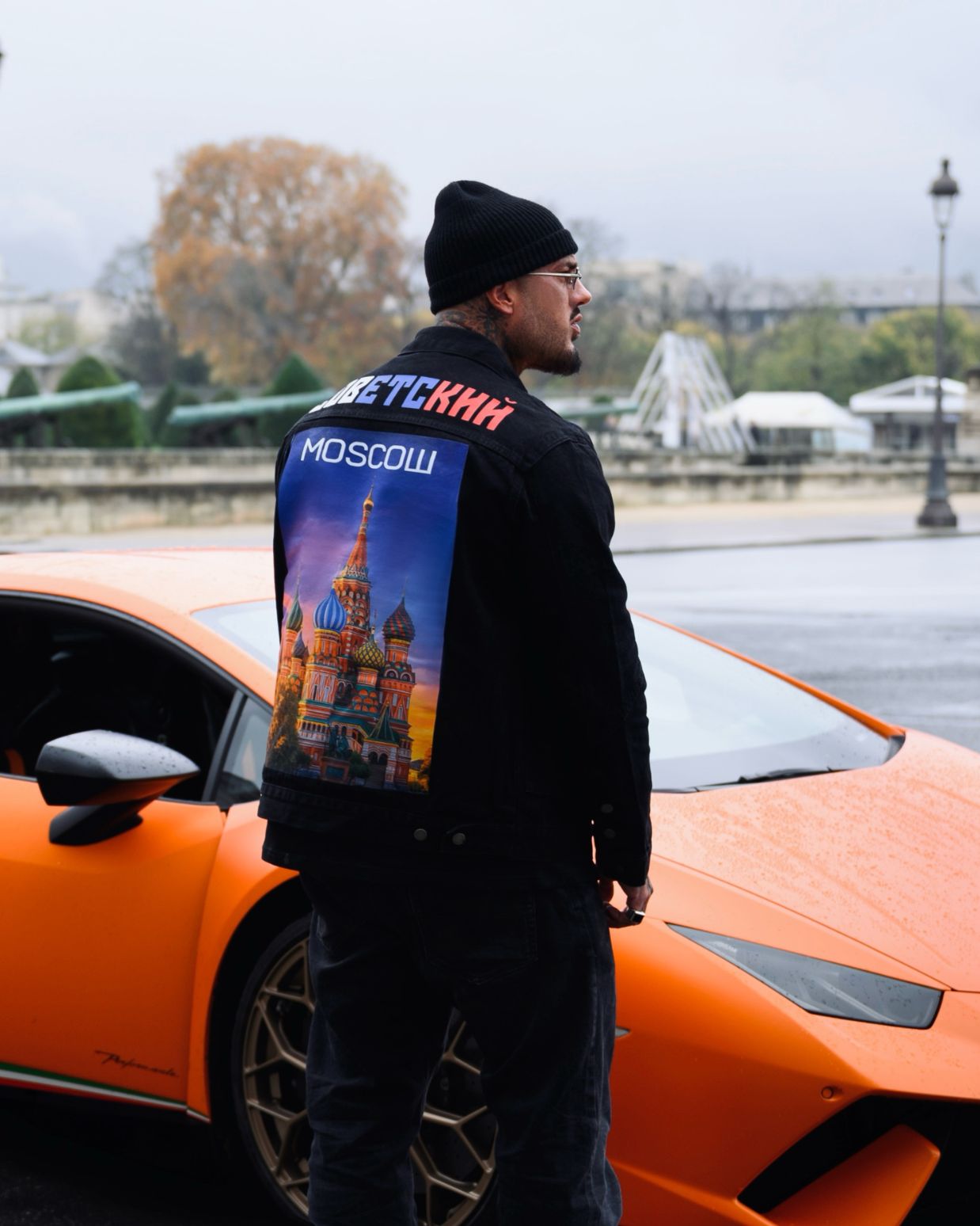 À l’arrière, un motif architectural inspiré de la cathédrale Saint-Basile de Moscou, aux couleurs vibrantes, transforme la veste en une pièce unique, revisité dans une approche graphique contemporaine.